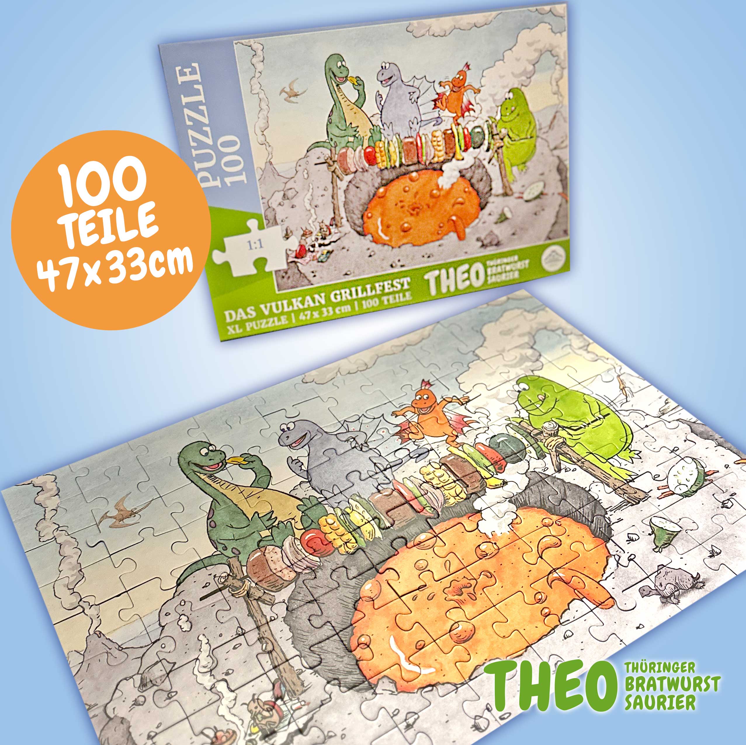 THEO XL Puzzle - "Das Vulkan Grillfest" Puzzle-Spaß für die ganze Familie. • 100 Teile (große Puzzleteile auch für kleinere Kinder ab 4 Jahre) • XL Puzzle Maß: 47 x 33 cm • Im hochwertigen Stülpdeckelkarton, eingeschweißt • Ideal auch als Geschenk (z.B. in Kombi mit dem Bilderbuch)